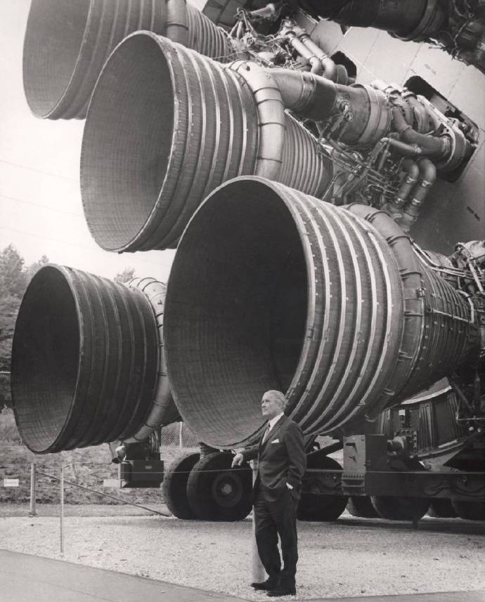巨大的F-1發動機和土星五號總設計師馮布勞恩合影,這麼巨大的“暴力”機器實際上“並不重”(圖源:NASA)