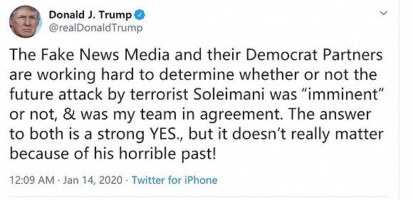 但這位美國總統至今給不出殺死蘇萊曼尼的情報理由,而在他看來,這也沒那麼重要:“假新聞媒體和他們的民主黨夥伴正努力確認來自恐怖分子蘇萊曼尼的未來襲擊是否真的迫在眉睫,以及我的團隊是否同意(幹掉他),兩個問題的答案都是肯定的。但這真不重要,你要知道他有可怕的過往!”