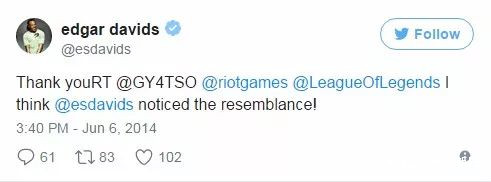 官司的內容很簡單,就是荷蘭知名球星戴維斯,狀告《英雄聯盟》的英雄角色皮膚“奪命先鋒”侵犯了自己的肖像權。其中最實錘的一點就是,遊戲公司的內容人員在推特上發消息稱:這款皮膚的靈感來源確實是戴維斯本人。