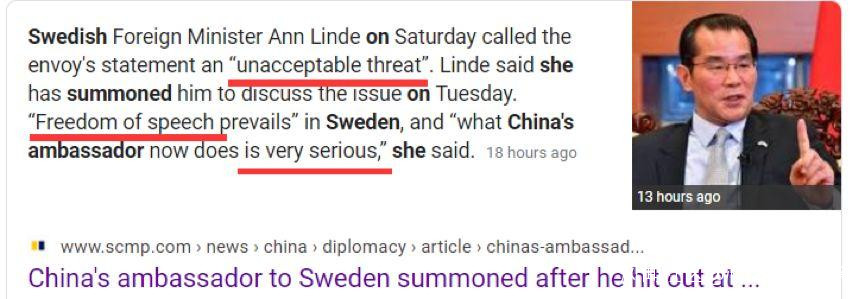根據香港《南華早報》的報道,瑞典外交部“召見”桂從友大使的原因,居然是認為桂大使批評瑞典媒體的言論是對瑞典和瑞典“言論自由”的“嚴重威脅”。