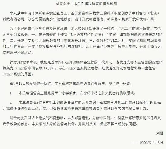1月17日,“木蘭”語言研發團隊負責人、中科院計算所編譯實驗室員工劉雷在科學網發表回應稱,“木蘭”語言在8位單片機上的編譯器是本團隊開發的,但在32位單片機上的編譯器是基於Python開源編譯器進行的二次開發。