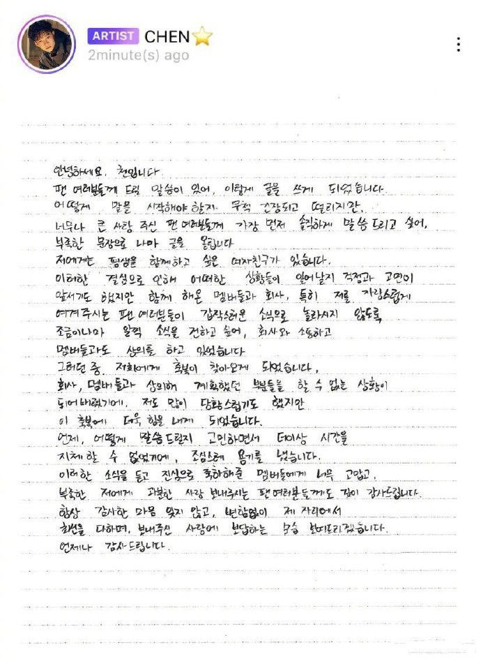 早前,韓國男團EXO成員CHEN(金鐘大)在社交網絡上通過手寫信的方式公佈婚訊,引發全韓關注。