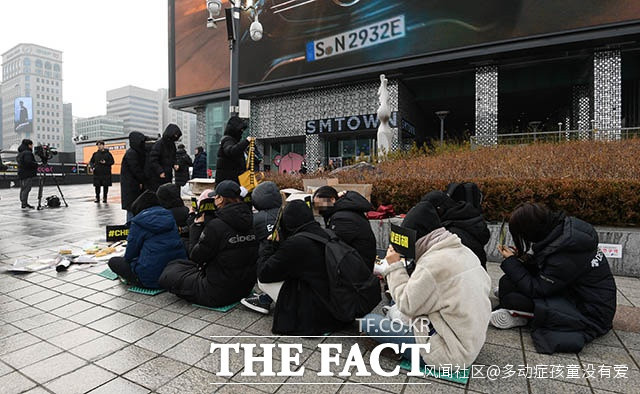 而在今天(19日)上午,果不其然,預計將近20人左右的粉絲後援會骨幹出現在SM娛樂的大樓外,拉起橫幅進行靜坐。