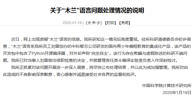 近日,網上出現質疑“木蘭”語言的信息。我所獲知這一情況後高度重視。經所科研道德委員會初步調查,“木蘭”語言系我所員工劉雷創辦的中科智芯公司研發的面向青少年編程教育的集成化產品,該產品的開發包中包含了Python開源編譯器,對外卻聲稱“完全自主”。該行為存在欺瞞與虛假陳述的科研不端問題。我所已對當事人劉雷做出停職檢查的決定,並就管理責任責令編譯實驗室負責人作深刻檢討。