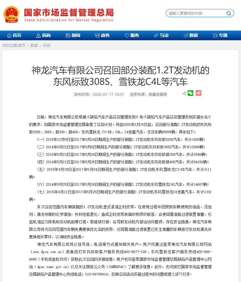 將自2020年2月15日起,召回部分裝配1.2T發動機的東風標緻2008、308S、新308、新408,東風雪鐵龍 C3-XR、C4L、C4世嘉汽車,涉及車輛89898輛。