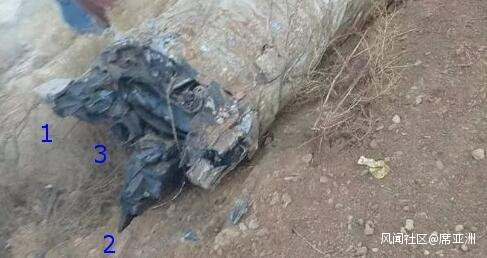 圖4是在伊拉克發現殘骸的另一張照片,這是另一個推特用户上傳的另一個角度的照片。可以看到標註1、2處是小型的尾翼,標註3則是渦輪泵的出口。據報道這個殘骸是在阿薩德基地30公里左右發現的。而從顯示助推器前段的照片圖5中可以看到,其頭部有一個小型的過渡段,這也和“起義2”導彈的特徵一致。