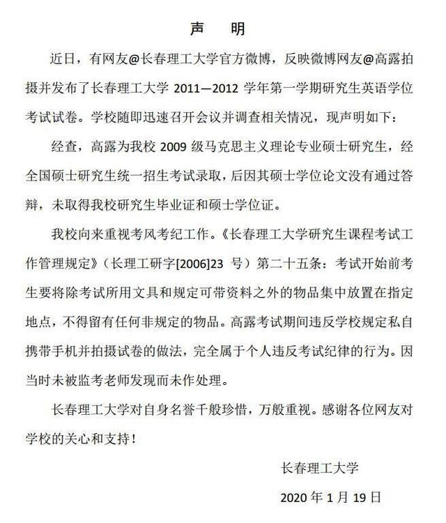 女子開車進故宮一事牽動了各方,有網友在社交媒體平台@了長春理工大學,因為疑似這名女生在該校就讀,並且取得了碩士學位證。對於這種説法,長春理工大學官方也是迅速進行了回應。長春理工大學官方聲明當中説出,這名女子拍攝了研究生的考試試卷,屬於違反考試紀律的作弊行為,但是因為監考老師並未發現所以未予處理。但是,在其學位答辯時,她並沒有通過答辯,也是因此並未取得長春理工大學的研究生畢業證和碩士學位證。