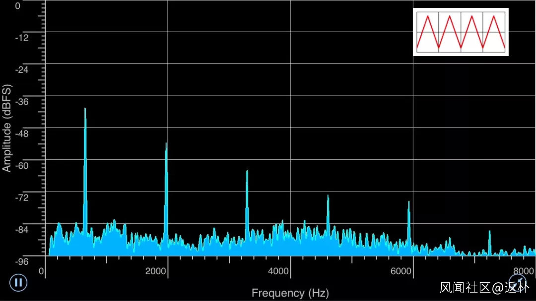 “三角波和正弦波差得不太多,所以新增加的這些峯比基頻那個峯矮不少,而且一個比一個矮。”