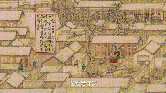 導演稱這類動畫為“場景復原動畫”,其中也參考了一些清代的宮廷畫,其中一幅叫做《弘曆京師生春詩意圖》。這幅畫有兩米多,它跨越時間和空間,結合了天象、氣候、宮制、民俗,將清代宮廷和百姓共迎新春的景象均展現其中。
