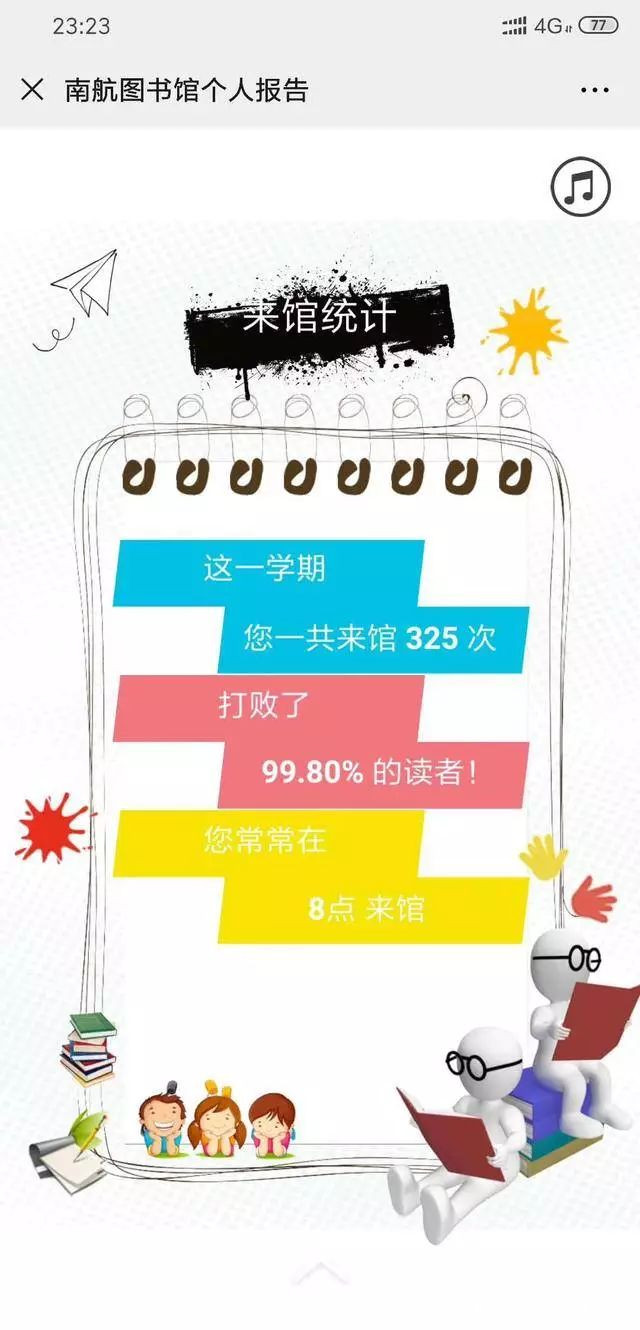 南航學生許同學不僅查閲了自己的年終閲讀報告,還曬在了朋友圈。“這一學期您一共來館325次,打敗了99.8%的讀者!”看着這樣的數字,小許覺得很滿足,“這是值得紀念的一年。”