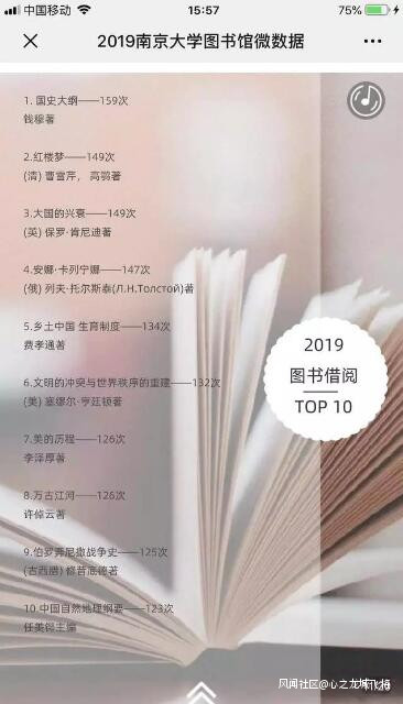 借閲TOP5:1.《國史大綱》2.《紅樓夢》3.《大國的興衰》4.《安娜·卡列寧娜》5.《鄉土中國 生育制度》