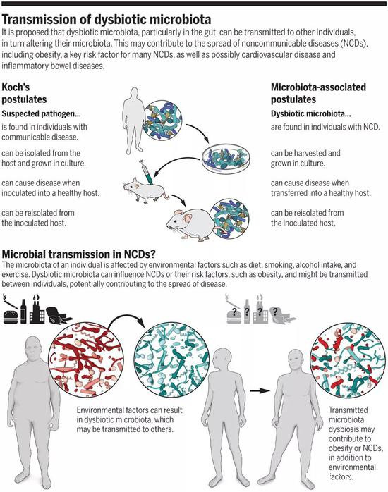 然而,頂尖學術期刊《科學》最近發表的一篇文章中,有科學家提出了新觀點,認為許多通常屬於“非傳染性”的疾病,比如肥胖、糖尿病、心血管疾病,也有可能通過微生物在人與人之間傳播。這些科學家提供的證據表明,在人類腸道內與我們共同生存的各種細菌、真菌和病毒,有可能是造成非傳染性疾病社會傳播的一個重要因素。