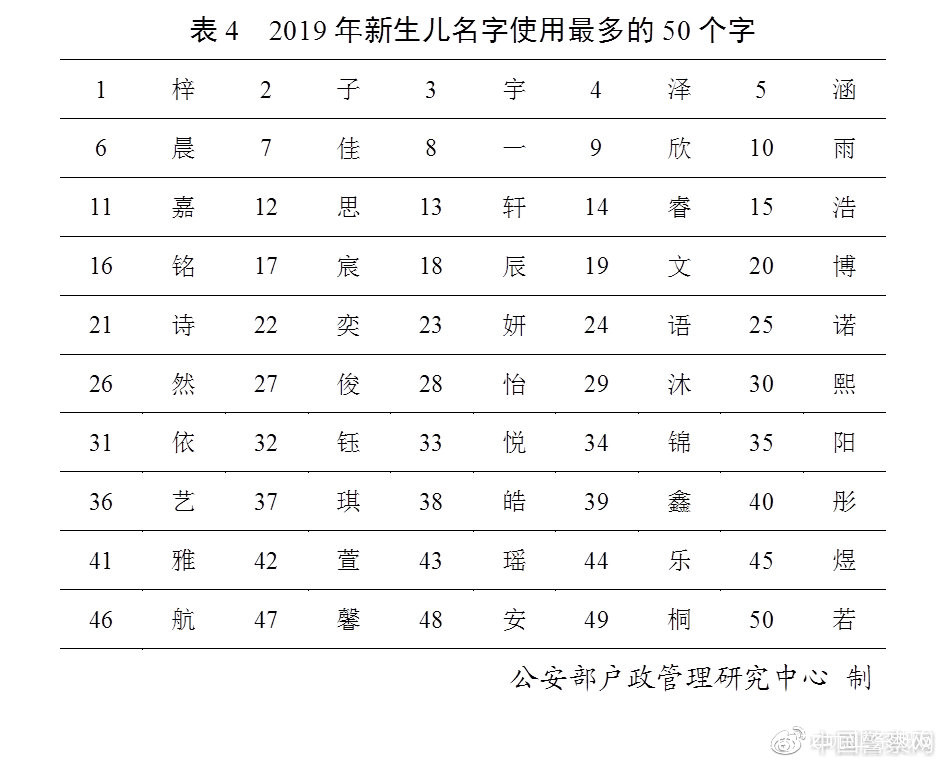 2019年出生並已經進行户籍登記的新生兒名字中,使用頻率最高的50個字依次為“梓”“子”“宇”“澤”“涵”“晨”“佳” “一”“欣”“雨”等。與2018年相比,“錦”“瑤”“煜”“安”等字新晉成為新生兒起名用字首選。(表4)