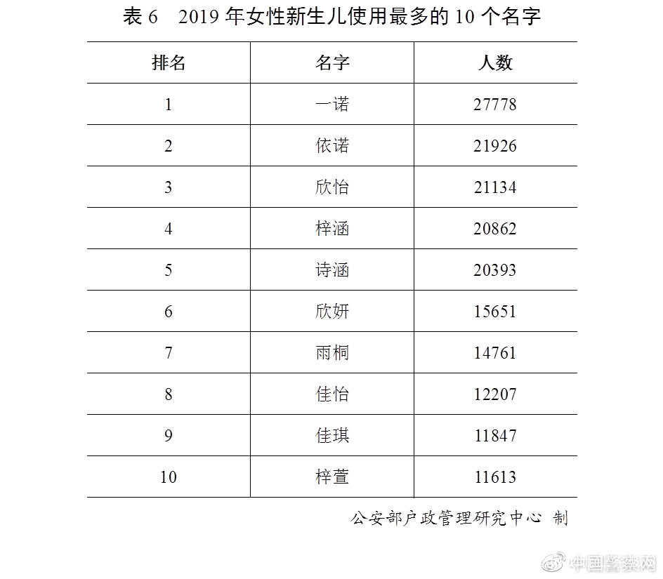 2019年出生並已經進行户籍登記的女性新生兒中,使用頻率最高的10個名字依次為:“一諾”“依諾”“欣怡”“梓涵”“詩涵”“欣妍”“雨桐”“佳怡”“佳琪”“梓萱”。與2018年相比,“佳琪”進入前十。(表6)