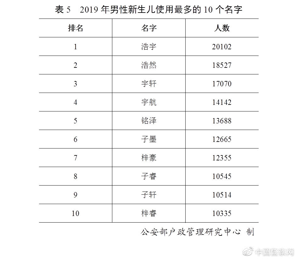 2019年出生並已經進行户籍登記的男性新生兒中,使用頻率最高的10個名字依次為:“浩宇”“浩然”“宇軒”“宇航”“銘澤”“子墨”“梓豪”“子睿”“子軒”“梓睿”。與2018年相比,“銘澤”“子墨”“子睿”“梓睿”進入前十。(表5)
