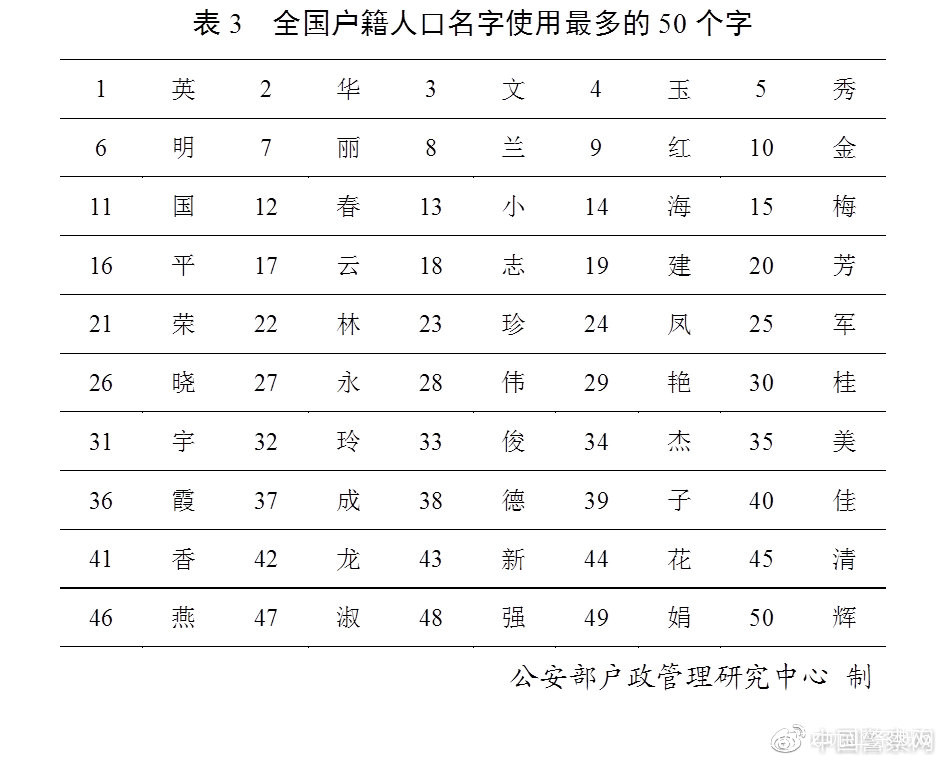 全國户籍人口中,名字使用頻率最高的50個字依次為“英”“華”“文”“玉”“秀”“明”“麗”“蘭”“紅”“金”等。(表3)