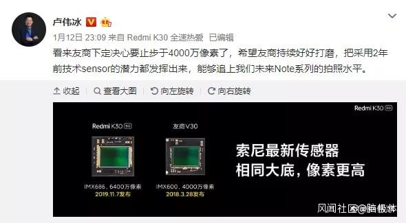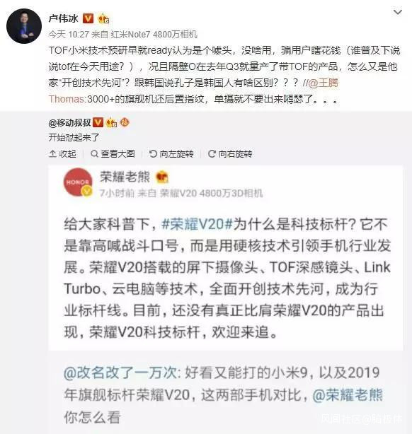 幾乎一整年的時間,小米高管們都在微博陣地與榮耀貼身鬥嘴。比如年初榮耀V20問世,率先配備了TOF立體深感鏡頭,在新鋭科技亮點上將同時期的小米9映襯的有些乏味。隨後小米的盧偉冰就發博聲稱“TOF鏡頭沒啥用”,結果很快被TOF鏡頭在行業中的創新應用和流行而打臉。