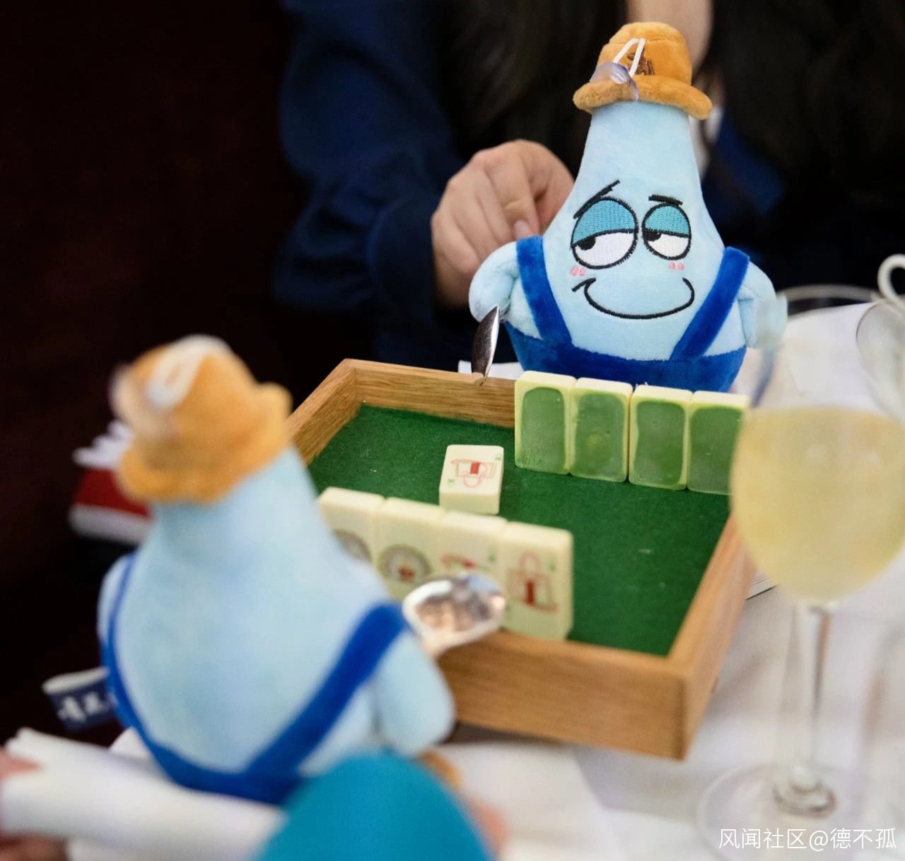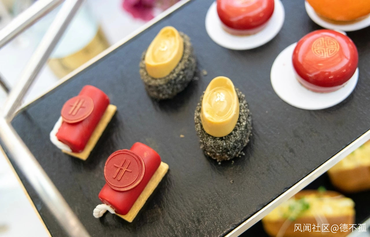 除了以金元寶、大橘子、紅鞭炮等春節喜慶元素為造型的甜點,這套下午茶裏還有以白巧克力和抹茶製作的四塊“麻將牌”,一杯中國白酒調製的雞尾酒,以及一小盅青花汾酒。