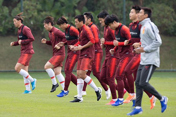 1月20日,國足球員在訓練課上熱身。新華社 圖