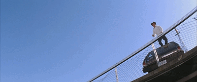 我就安排他跳樓,是人家逼得你無路可逃,人家脱褲子叫你kiss my ass,這個是最羞辱中國人的,然後成龍把轎車上的天線抽下來打那個人屁股,然後再跳樓,那個是另類的英雄的表現的方式。你想想,當時是一箇中國人抽一個白人的屁股!那時候中國電影還打不進好萊塢的,我們中國還沒這麼強大,人家還看不起我們的時候,我就敢這樣拍了。