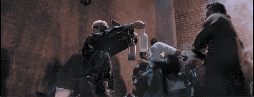 **唐季禮:**有道具,也有真的,假的一打下去沒有爆炸力,所以我跟大哥溝通了,丟牆上的那些用真的啤酒瓶。但有一個打向成龍肚子的啤酒瓶也是真的,那個沒爆,假的一丟就破了,所以那個我就用真的。