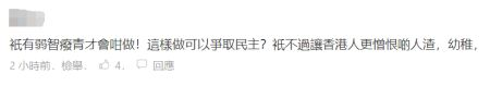 對於暴徒的惡行,有網友批評“沒本事競爭、沒能力生存的人才會不停地搞破壞表達心中自卑的不忿……鄙視”、“只有弱智廢青才會這樣做!這樣做可以爭取民主?只不過讓香港人更憎恨那些人渣,幼稚”。