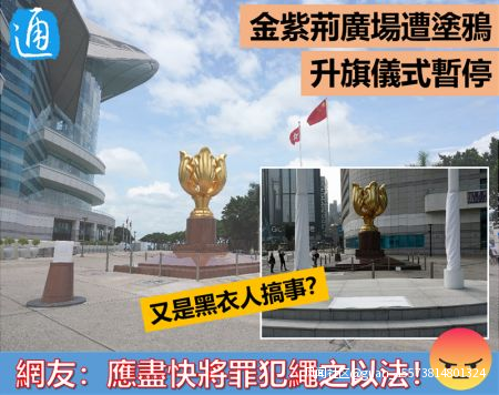 綜合港媒報道,今日早上8時許,有保安員發現金紫荊廣場兩支旗桿、旗桿底座,及金紫荊雕塑下的紅色花崗巖底座,遭人用黑色噴漆噴上符號,職員隨後用黑色膠紙及白布將塗鴉遮蓋。