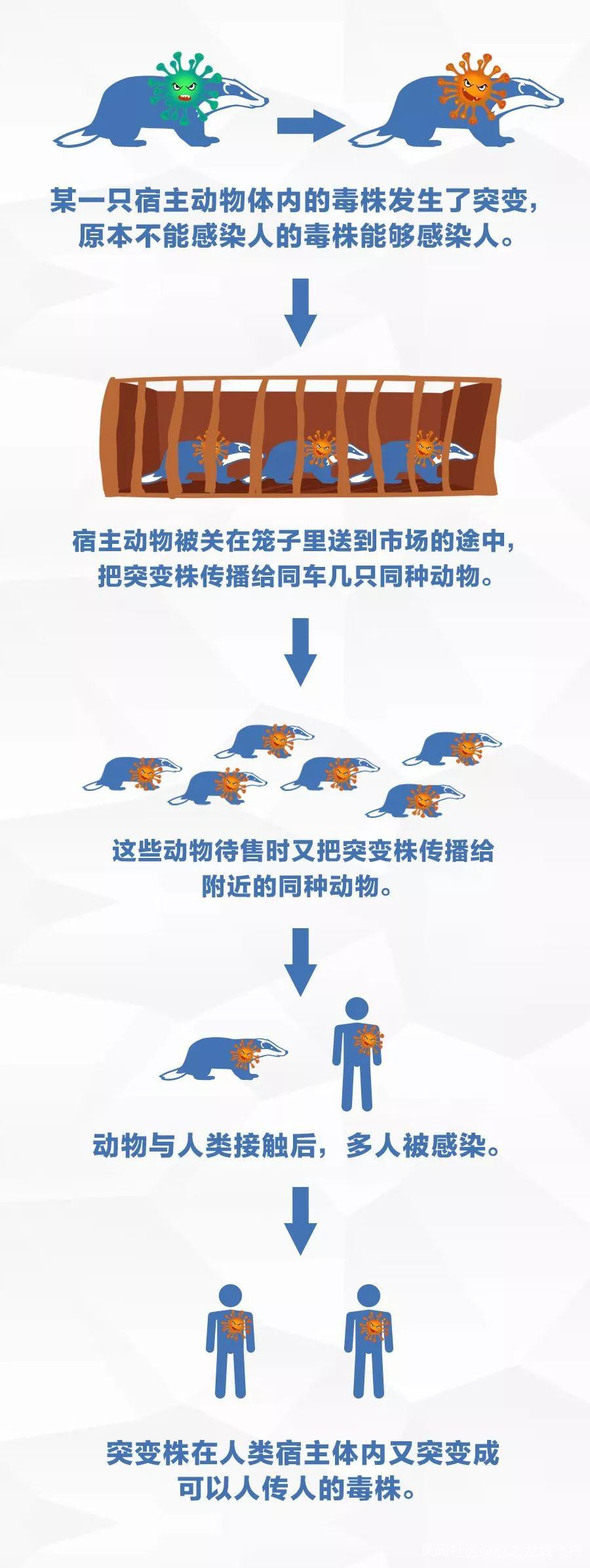野味市場是疫情最先爆發的地點。近來的幾次冠狀病毒嚴重疫情,都是通過其他脊椎動物感染人的。 目前看來,很可能是這樣一種情況: