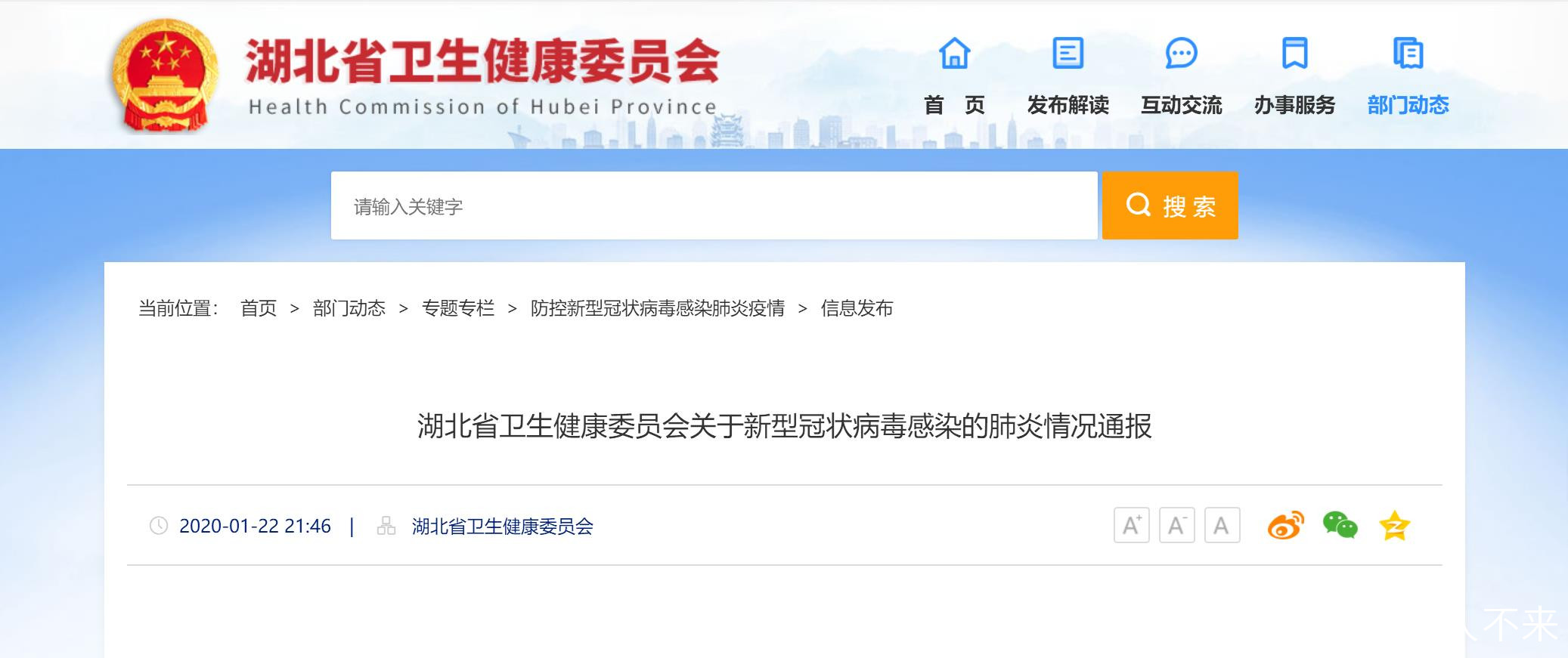 22日晚21時46分許,湖北省衞生健康委員會發佈關於新型冠狀病毒感染的肺炎的最新情況通報:
