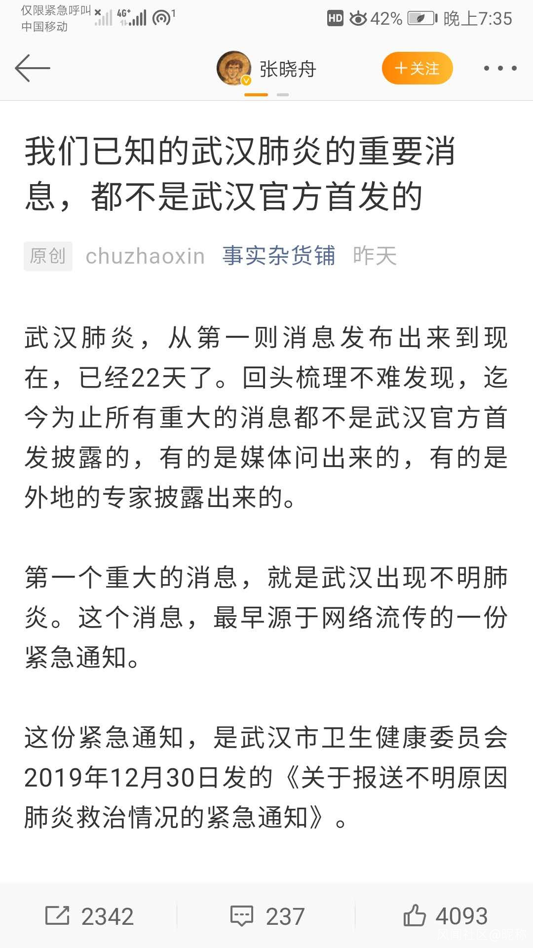這篇文章最核心的立腳點,肺炎的所有的重大消息都不是由武漢官方首發披露的,其實在這裏就已經立不住了,但我沒想到的是,所有人竟然還繼續的往下看,並且對他立不住腳的觀點深信不疑。