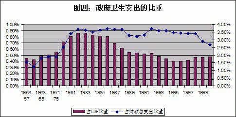 圖四中所謂"政府衞生支出"包括兩大塊,一塊是"衞生事業費”,一塊是"衞生基建投資"。政府對衞生工作還有其它項目的支出,但這兩項是大頭,其餘的是小頭。圖四告訴我們,無論是政府衞生支出佔財政總支出的比重,還是佔GDP的比重,在"一五"至"五五"期間都是呈上升態勢,雙雙在改革開放初年達到歷史最高點。1983年以後,1992年以前,衞生支出佔財政總支出的比重時起時伏,好像變化不大。但是,在此期間,由於實行"放權讓利"的財政包乾制,政府財政收支佔GDP比重急劇下降,結果導致衞生支出佔GDP比重一路下滑。1992年以後,儘管政府對衞生投入的絕對數在增加,衞生支出佔財政總支出的比重狂跌不止,到2000年也沒有止住。到1995-96年,衞生支出佔GDP的比重也跌到了歷史最低點。只是在最近四、五年,該比重才有輕微回升。“一打綱領不如一個行動”,從政府過去20年的財政支出結構看,公共衞生的確一直不是其重點。