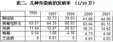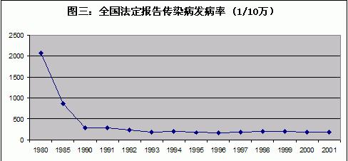 進入九十年代下半葉,中國健康領域的不祥之兆似乎越來越多。本來,中國在傳染病和地方病的防治方面曾取得過舉世公認的巨大成就,充分顯示了社會主義制度的優越性。但最近的一些趨向十分令人不安。我國法定報道傳染病的發病率50年代是,每10萬人3200,到1990年已下降到每10萬人292。此後,進展開始放緩;1995年以後甚至有回升的跡像(見圖三)。結核病便是一個例子。在建國的頭三十年,雖然資源比較匱乏,結核病的發病率下降了60-70%;後二十年,儘管資金更加充裕,治療手段更加成熟,發病率不僅沒有下降,反而有上升的趨勢。據估計,中國大約有四億人受過結核病感染,其中將近10%的人會發病。目前,全國約有500萬肺結核患者,居世界第二,佔全球結核病患者總數的四分之一,而且其中相當多的人已具有抗藥性。病毒性肝炎的情況更是不容樂觀,其發病率高於結核病,並一直居高不下。現在,中國乙型肝炎病毒攜帶者的數量高居世界第一。很明顯,這樣的世界第一、第二絕不是什麼值得誇耀的事。