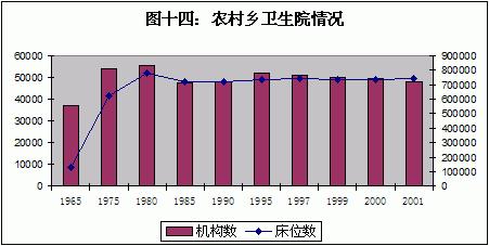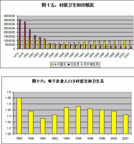 本來,縣鄉村三級醫療防疫保健網是我國衞生體系的特點和優勢,在第一次農村衞生革命中發揮了關鍵性作用。其中,鄉鎮衞生院是三級保健網的樞紐,發揮着承上啓下的作用,承擔着預防保健、基本醫療、衞生監督、健康教育、康復、計劃生育等基本衞生服務;村衞生室是"網底",在為村民羣眾提供安全方便的常見病診治服務,在公共衞生和預防保健方面發揮着重要作用。但是,八十年代以後,大批專業醫療人員從農村返回城市,鄉鎮衞生院的人才大量流失。加之鄉鎮財政實力有限,大多數鄉鎮衞生院所獲的補助是越來越少,生存面臨危機。與1980年相比,無論是農村衞生院的數量還是其牀位數,都沒有增加,只有減少(見圖十四)。據衞生部長説,全國鄉鎮衞生院中,三分之一很好,三分之一勉強維持,三分之一基本散了架子。那些很好的衞生院集中在東部沿海省份,而西部的衞生院可以説是慘不忍睹。不少地方以"改革"的名義,已將鄉鎮衞生院租賃、甚至拍賣轉讓給個人。仍然運轉的衞生院也往往是舉步為艱。由於財政支持不足,鄉衞生院難以留住人才,醫療設備很少更新,因而難以提供老百姓需要的醫療衞生服務。病人少導致衞生院收入少,收入少導致服務水平低,服務水平低導致病人更少。結果,相當多的鄉鎮衞生院陷入惡性循環。