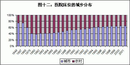 城鄉差別解放以前,中國農村缺醫少藥,傳染病、地方病肆虐,廣大農民的健康水平十分低下。新中國成立以後,人民政府在發展經濟的同時,大力發展農村衞生事業,廣泛建立了基層衞生組織,改善了農村的衞生狀況。但是毛主席對進步的幅度並不滿意。1965年6月26日,他發表了著名的"六二六指示",號召"把醫療衞生工作的重點放到農村去"。此後,醫療資源"重城市輕鄉村"的情形得到扭轉。以全國醫療衞生機構病牀的分佈為例,1965年農村只佔總數的40%,短短十年後,到1975年,這個比重已提高到60%(見圖十二)。這種根本性的轉變,極大地改善了農村的醫療條件。同時大批城市醫療專業人員組成巡迴醫療隊奔赴農村,為提高農村基層衞生組織防治疾病水平、培訓赤腳醫生髮揮了很大的作用。1968年底,毛主席又批示推廣湖北省長陽縣樂園公社的合作醫療經驗,並很快在全國掀起了舉辦合作醫療的高潮。到1980年,全國農村約有90%的生產大隊(行政村)實行了合作醫療,形成了集預防、醫療、保健功能於一身的三級(縣、鄉、村)衞生服務網絡。這個網絡,除了51萬正規醫生外,擁有146萬不脱產的生產大隊赤腳醫生、236萬生產隊衞生員、還有63萬多農村接生員。中國農村這次衞生革命基本上實現了"小病不出村、大病不出鄉"的目標,被世界衞生組織和世界銀行譽為"以最少投入獲得了最大健康收益"的"中國模式"。當然,既使在這個時期,城鄉之間在醫療衞生方面的差距依然存在,但畢竟比以前大大縮小了。那麼,改革開放以後的情況如何呢?