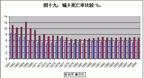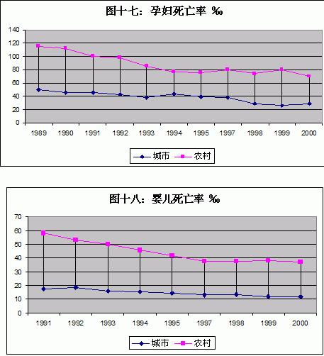 合作醫療的解體,嚴重影響了農户的看病行為;三級醫療預防保健網的破損,使一些已經消滅或控制的傳染病再度復發;再加上城鄉居民收入差距的擴大,使健康狀況方面的城鄉差距不僅沒有縮小,反而有所擴大。就疾病模式而言,城市的特點是以慢性非傳染性疾病為主,而農村、尤其是中西部農村,依然是以感染性疾病和營養不良為主導。婦幼健康方面的城鄉差距更為明顯。農村的孕婦死亡率和嬰兒死亡率一直比城鎮高得多(見圖十七和十八)。從趨勢上看,九十年代中期以前,這兩方面的城鄉差距好歹在縮小。但1995年以後,改善的勢頭消失了;九十年代末,差距還有擴大的跡像。人口死亡率方面的數據相對比較齊全,因此恐怕更能説明問題(見圖十九)。從1957年到1980年,農村人口死亡率下降幅度明顯快於城鎮,使城鄉差距迅速縮小。但1980年以後,農村人口死亡率幾乎沒有什麼變化,城鎮人口死亡率還有所下降。結果,在改革開放的二十多年裏,人口死亡率方面的城鄉差距不僅沒有縮小,反倒擴大了。至於人均期望壽命,沒有系統數據。但據2000年進行的第五次全國人口普查資料計算,中國人均期望壽命為71。4歲;其中,城鎮居民人均壽命75。21歲,農村居民人均壽命69。55歲,前者比後者高出5歲多,相當於發達國家與中等收入國家之間的差距(見表一)。