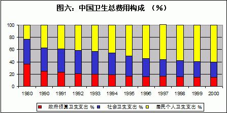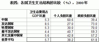 與其它國家進行比較,我們發現,中國的醫療衞生領域恐怕是世界上最市場化的之一。以前,有些人總是以中國是發展中國家來反對政府對醫療衞生"包攬太多"。看看錶四便會明白,這種託詞實際上沒有任何道理。2000年中國衞生總費用佔國內生產總值的5。3%,略高於世界衞生組織規定的5%的下限。其中居民個人支出部分佔60。6%,而這一比例在發達國家是27%。既使排除發達國家,這個比重在其它國家也低得多,包括最不發達國家。如果世界上最窮的國家都能由政府負擔近六成的醫療衞生費用,經濟欣欣向榮的中國有什麼理由做不到呢?