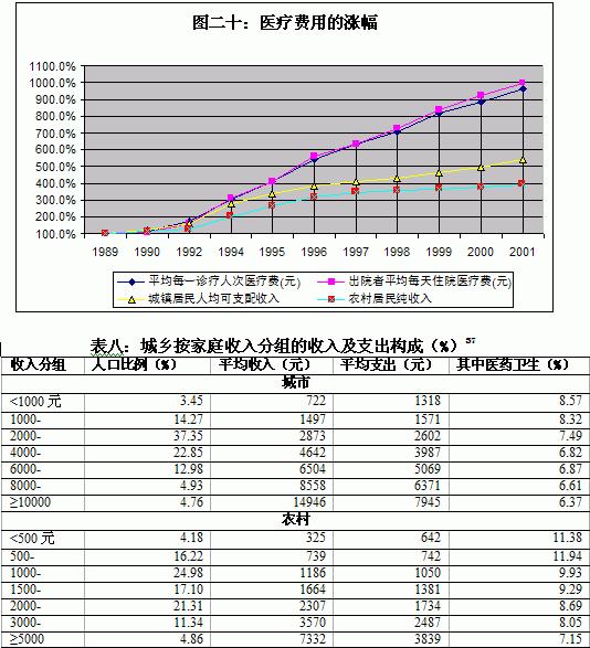 政府失職和市場失靈造成醫療費用的快速攀升,漲幅遠遠超過城鄉居民收入。從圖二十我們可以看到,按當年價格計算,在1989-2001年間,城鎮居民人均收入增長了544%,農村居民人均收入增長慢的多,只有393%。而在同一時期,診療費和住院費分別增長965%和998%。可見,醫療費用的增長速度幾乎是城市居民人均收入的一倍,是農村居民人均收入的兩倍。即使考慮到農村的醫療費用相對較低的因素,農民醫療費用的增幅恐怕仍大大超過城市居民。