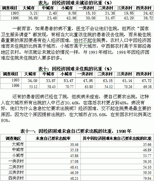 由上面三個表我們看到,無論是在城市,還是農村,在表面繁榮的經濟背後都掩蓋着一個相當規模的貧困羣體。他們有病不敢去看,病情嚴重該住院不敢住院,住了院尚未痊癒便匆匆離去、生怕背上沉重的經濟負擔。衞生部衞生統計中心對兩次調查原始數據進行的多變量分析證實了這個判斷。他們發現:在關於1993年情況的多變量模型中,除了疾病嚴重程度、健康狀況、年齡和文化程度外,收入水平、衞生服務可得性和醫療保險制度等因素並不怎麼影響城市居民就診率和住院率。這説明在九十年代初,城市居民門診和住院利用較為充足。而在關於1998年情況的模型中,收入水平、就業狀況、貧困程度和有無醫療保險對就診率和住院率有着十分顯著的影響,表明城市不同階層在醫療服務利用上的鴻溝正在拉大。與城市相比,影響農村醫療服務利用的主要變量一直是經濟因素(恩格爾係數和收入水平)。兩次調查的模型結果基本一致,但這個因素的影響在1998年比1993年大。