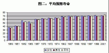 在這樣的背景下,我們當然希望看到中國人民的健康狀況在這些年裏大為改善。但現實並非完全如此。國際上通常用兩個指標來反映和比較一個國家國民的健康狀況。一是平均期望壽命,一是嬰兒死亡率。談到這兩項指標,我們的政府官員往往會很自豪地指出,我國的平均壽命己從解放前的35歲上升到2001年的71。8歲,高於世界平均壽命(65歲)和中等收入國家的平均壽命(69歲)。同時,我國的嬰兒死亡率也從解放前的200‰左右下降到目前的32‰,而世界的平均水平是44‰,中等收入的國家是30‰。不錯,從這兩個國際通用的指標來看,中國人民的健康水平總體上的確已經處於發展中國家的前列。達到了中等收入國家的平均水平。但是,人們往往忽略了一個簡單的事實:如此輝煌的成就主要是在八十年代以前取得的。圖二描繪了我國人均期望壽命在1960-2001年間的變化,它清楚地表明,人均壽命的增長基本上是在六十年代和七十年代完成的。八十年代以後,增長似乎失去了動力。