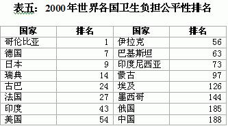 2000年,世界衞生組織對191個會員國的衞生系統分三個方面進行了績效評估。在衞生負擔公平性方面,中國被排列在第188位,即倒數第四位,僅比巴西、緬甸、塞拉里昂稍強,屬於世界上最不公平的國家。而一向被我們看作"貧富懸殊極大"的印度卻排名第43位,居世界前列,遠遠超過我國。遭受近十年經濟制裁的伊拉克表現也不俗,排在第56位。其它發展中人口大國如巴基斯坦、印度尼西亞、埃及、墨西哥都排在中國前面。這對一個自稱"社會主義"的國家來説,實在是莫大的恥辱。