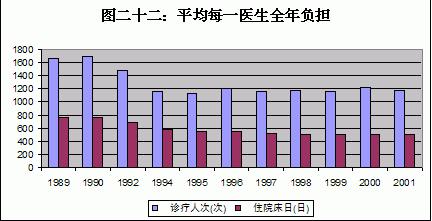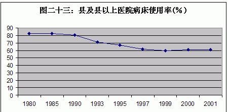 在門診量減少的同時,住院病人增加不多,而醫護人員的數量仍在增加,其後果必然是醫療資源的浪費。這可以從三個指標看出來,亦即平均每一醫生全年負擔診療人次、平均每一醫生全年負擔住院牀日、病牀使用率。由圖二十二可見,與八十年代末相比,前兩個指標都呈下降趨勢:診療人次由1989年的1652下降到2001年1180,住院牀日在同一時期從767下降到509。病牀使用率也出現明顯的下降。全國醫院的病牀使用率在八十年代一直維持在80%以上;進入九十年代便一路下滑,現在跌到60%的水平。