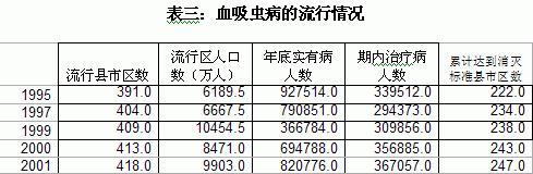 地方病方面的形勢令人喜憂參半。一方面,大骨節病,“克山病”,碘缺乏病的患者人數有所減少;另一方面,上世紀五、六十年代已被送走的瘟神血吸蟲病又捲土重來。血吸蟲病曾困擾中國人達2000年之久。對此毛澤東感嘆地寫道:“綠水青山枉自多,華佗無奈小蟲何”。解放前,全國有2000多萬患者。那時,疫區的情況是"千村薜荔人遺矢,萬户蕭疏鬼唱歌。"。五、六十年代,中國政府領導疫區人民打了一場消滅血吸蟲的人民戰爭,基本上消除了這種地方病。但八十年代後期,血吸蟲病重新出現。如表三所示,近年來,血吸蟲病的流行縣有增無減,患者人數上下反覆,呈膠着狀態,並沒有好轉的跡像。在有些地方,如江西的都昌縣,湖北的荊州、沙市、江陵、黃石、陽新等縣市,形勢還十分嚴峻。