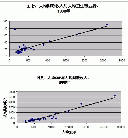 那麼各省人均財政收入的水平又是什麼決定的呢?看看圖八,答案就一目瞭然了:經濟實力越強、人均GDP越高的省份,人均財政收入也越高。自從八十年代初中國實行"分灶吃飯"的財政包乾體制以後,各省政府為本地居民提供公共服務的水平就取決於本省的經濟發展水平。在全國範圍內,缺乏一套有效的財政轉移支付體制來平衡各地的公共服務水平,包括醫療保健水平。1994年實行"分税制"後,情況有所改善,但到目前為止,中央財政的實力還不夠強,跨地區財政轉移支付的力度還不夠大,因此,各省的人均衞生事業費、教育事業費等還相去甚遠。從圖七可以看出,1998年,各省人均衞生事業費最高的達90元(上海),最低的只有8。5元(河南),兩者相差十倍之多,真可謂天壤之別。