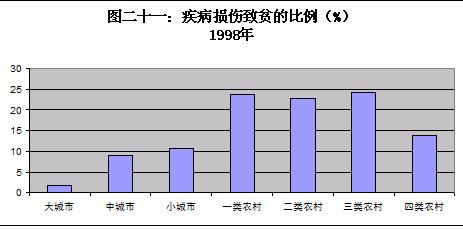 “小病扛、大病拖"的後果往往是小病拖成大病,大病導致勞動力喪失,甚至傾家蕩產。越來越多的證據表明,“因貧致病,因病返貧"的惡性循環正在變成中國城鄉的一個突出社會問題。鉅額醫療費用或勞動能力的喪失使許多人的生活水平降到貧困線以下。1998年的"第二次國家衞生服務調查"發現疾病損傷是農村致貧的重要原因。至少在當時,疾病並不是大城市貧困的重要原因。但在中小城市貧困人口中有百分之十左右是因病致貧。而在沒有任何醫療保障的農村,一場大病,可以使原本殷實的小康之家陷入困境,使原本貧困的一貧如洗。所以,農村因病致貧的比例平均為22%(見圖二十一)。實際上,在有些省份,農民因病致貧,因病返貧的問題要嚴重得多。如有關部門對湖北、江蘇、廣東三省農户典型調查發現,“因病致貧"佔貧困户的比例達30%;在河南、陝西、四川、甚至北京郊縣,因病致貧的農户,佔貧困户總數的40%-50%;在青海,這個比例達56%。正是因為疾病不僅嚴重威脅着貧苦農民的健康,還威脅着他們的生存,他們才會説出"不怕窮、就怕病"這樣讓人心酸的話。