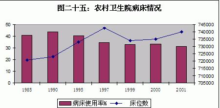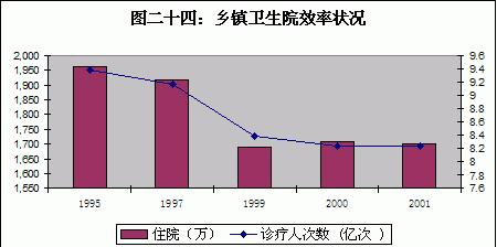 農村縣以下衞生機構的資源利用效率也在下降。鄉鎮衞生院醫生的總數從1995年的42。5萬人增加到2001年的51。9萬人,但與此同時,每年到鄉鎮衞生院看病的人從9。38億人次減少到8。24億人次。以每年工作300天計,每位醫生每天的診療服務量從7。36人次降到5。29人次。在此期間,鄉鎮衞生院的病牀牀位有所增加,不過住院的人卻大幅下降,從1995年的1960萬人滑到2001年的1700萬人(見圖二十四)。結果,鄉鎮衞生院的牀位使用率從40。7%下降到31。3%(見圖二十五)。另外,諸如心電圖、B超和X光機等儀器設備的使用率也很低。以心電圖為例,既使在比較發達的一類農村地區,平均每天使用1。2次而已;在落後的四類農村,平均十天才用一次。