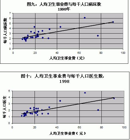 年復一年,人均衞生事業費的分佈都是這樣不平等。久而久之,衞生事業費的差距轉化為衞生設施的差距。圖九和圖十描繪了人均衞生事業費與平均每千人口病牀數以及每千人口醫生數的關係。看得出來,人均衞生事業費越高的省份,每千人口平均擁有的醫院牀位和醫生也多一些。兩個省份比較例外。一個是北京,它的人均衞生事業費沒有上海高,但人均牀位數和醫生數卻拔得全國頭籌,因為衞生部直屬的很多醫療機構設在首都。另一個是西藏,由於是少數民族占人口絕大多數的地區,有來自中央的特別補貼,人均衞生事業費很高,不過人均牀位數和醫生數在全國排位屬於中等水平。不管怎麼説,圖九和圖十顯示,各省間衞生設施的差距實在不小。