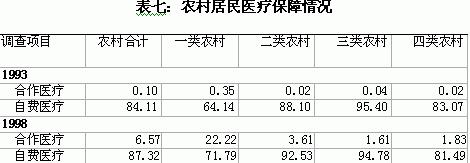 上面提到,我國農村曾實行過廣受國際讚譽的合作醫療制度。但是,實行聯產承包責任制以後,家庭成為農村的基本生產單位。同時,政府對合作醫療又採取了放任自流的態度。失去了政策的支持,集體經濟的衰落又瓦解了其賴以生存的經濟基礎,農村合作醫療因而迅速崩潰。取消人民公社兩年後,1985年的一項調查表明,全國繼續堅持實行合作醫療的行政村由過去的90%猛降至5%;1989年,這個比重降到4。8%。僅存的合作醫療主要分佈在上海郊區和當時以集體經濟為特徵的蘇南地區。