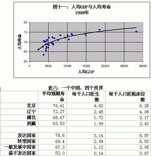 上面説的都是與政府衞生事業費相關的問題。這筆資金固然很重要,但它在衞生總費用中只佔小頭,居民個人在醫療保健上的支出才是大頭。顯而易見,居民個人平均醫療保健支出在各省的分佈完全取決於當地人均收入的高低。各省間經濟差距有多大,居民個人醫療保健開支的差距也就有多大。既然,無論是政府預算對衞生事業的撥款,還是居民個人在醫療保健上的開銷都存在着巨大的地區差距,可想而知各省居民的健康狀況也不可避免地會有差異。如果用人均期望壽命作為衡量各地總體健康狀況的指標,我們發現,各省的人均GDP與人均壽命高度相關(見圖十一)。人均壽命最高已達約77歲,而最低只有63。5歲。與世界各類國家進行比較,中國各類省份的衞生設施和健康指標可以證實胡鞍鋼的這樣一個判斷:中國國內存在着"四個世界"。北京、上海可以與發達國家媲美;東北三省和東南沿海省份與東歐轉型國家不相上下;中西部省份略比一般發展中國家好一些;有些西部省份比發展中國家還差一點,但比最不發達國家強。