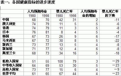 也許有人會説,八十年代以後進步之所以緩慢,是因為人均壽命的基數已經比較大,不像以前基數低時那麼容易取得顯著的成果。為驗證這種説法的合理性,表一將中國在人均期望壽命和嬰兒死亡率兩方面的進步與其它國家進行了比較。在1980年,亞太地區有五個國家和地區的人均壽命高於中國。如果上述説法正確的話,它們百尺竿頭、更進一步的可能性應該比中國要小。但實際情況完全不是如此。在1980-1998年間,中國的人均壽命增加了兩歲,而基數比中國高的澳大利亞、香港、日本、新西蘭和新加坡增加了4-6歲;與中國基數相同的斯里蘭卡,增加了5歲。再看嬰兒死亡率,在1980年,亞太地區各國都比中國低,但到1998年,還有三個國家(韓國、馬來西亞、斯里蘭卡)的下降幅度比中國大。其餘五個國家和地區下降的幅度沒有中國大,不過它們的嬰兒死亡率已降到千分之五以下,實在很難再降了。