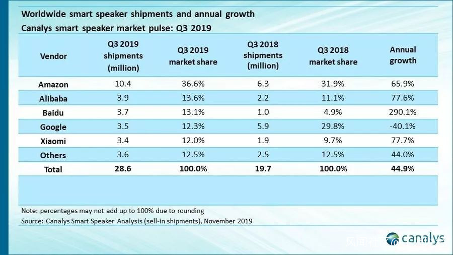 據Canalys數據顯示,2019年第三季度,全球智能音箱出貨量為2860萬台,同比增長了44.9%。其中,阿里、百度的智能音箱的出貨量分別為390萬台、370萬台,分別位列全球銷量第二名、第三名。而小米作為處於IoT產業頭部的手機廠商,則以340萬台的銷量排名被百度超越,排名第五。